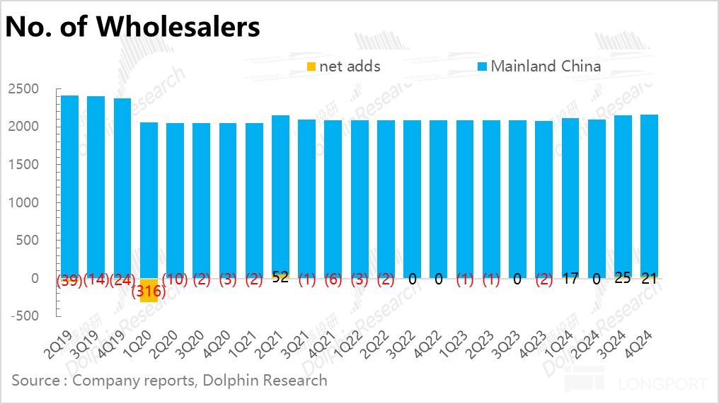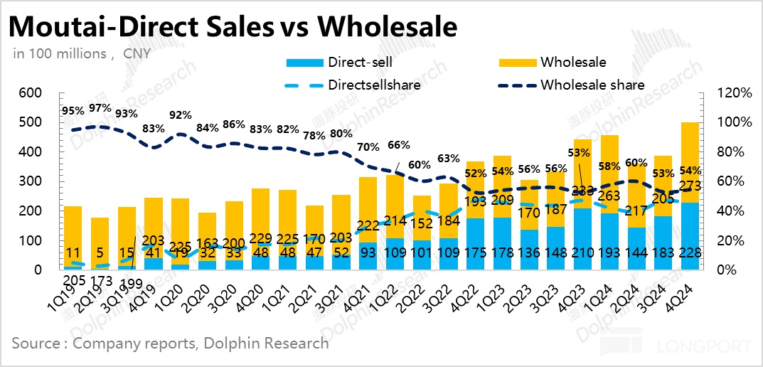 4、直营占比维持高位。从渠道结构上看,4Q24 直营占比为 45.5%,相较于 Q3 47.2% 虽然稍有下滑但仍然维持高位,主要系公司 Q4 加大了非标产品(1000ml 飞天、文创产品等)的投放力度(非标产品往往通过直营渠道投放),此外,系列酒增速放缓也使得经销渠道占比阶段性走低。(系列酒目前经销渠道占比较高)。通过调整茅台酒&系列酒的投放比例以达成业绩目标也算是茅台的经典操作。