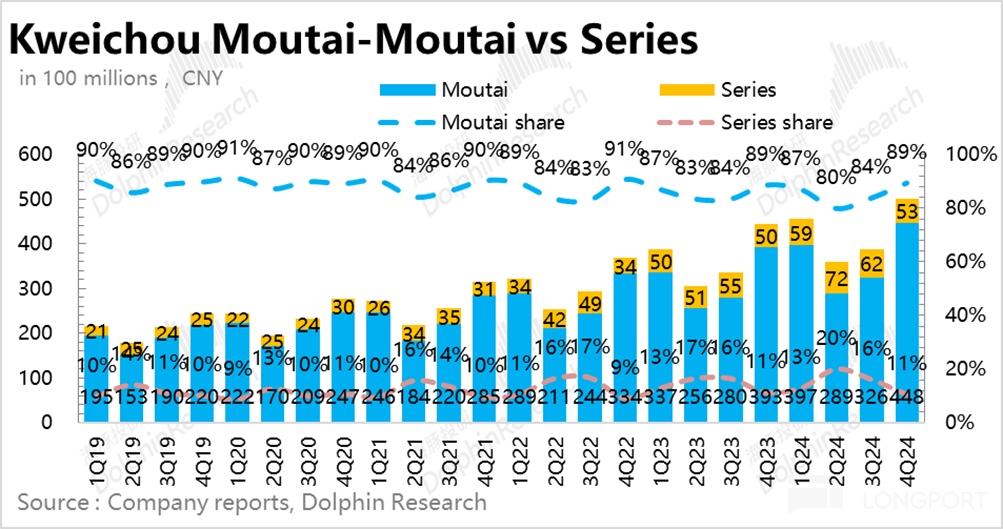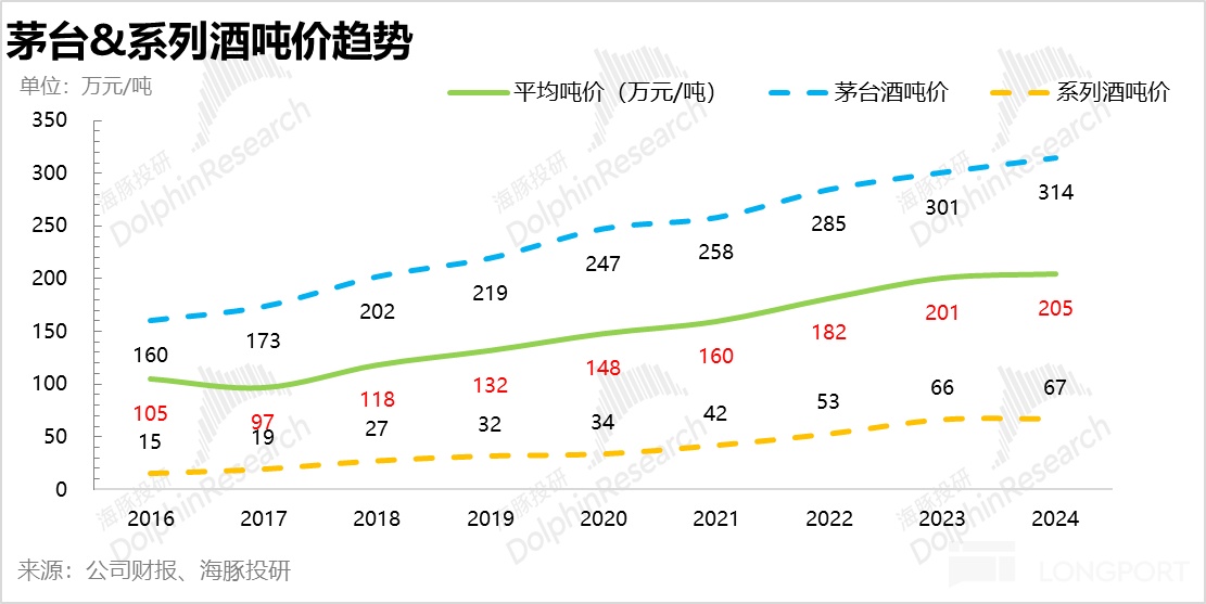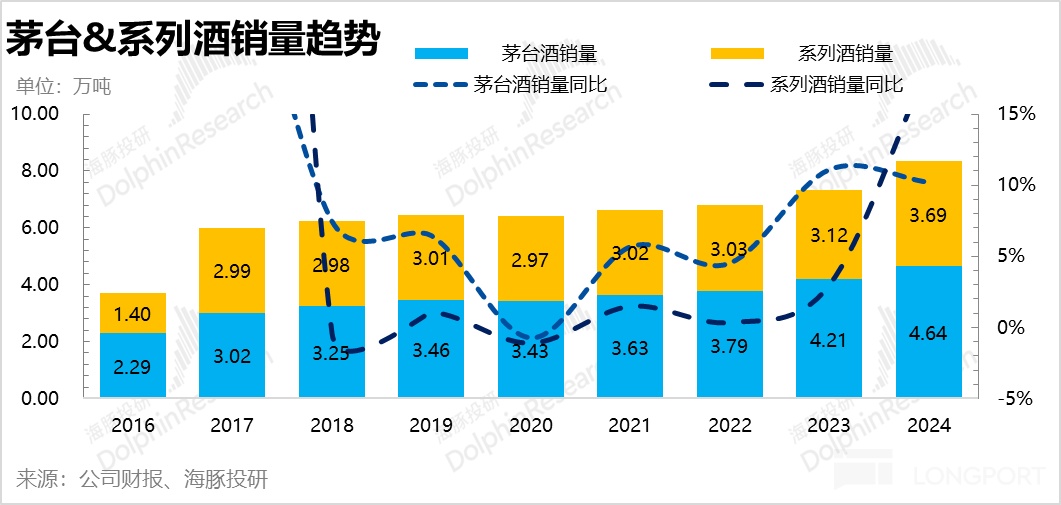 2、茅台酒:量价齐增。4Q24 茅台酒实现营收 448 亿元,同比增长 13.9%。全年维度来看,2024 年全年茅台酒实现销量 4.6 万吨,同比增长 10.2%,如果从 5 年前茅台酒产量来推测当年销量(2019 年茅台酒实际产量仅增加了 0.02 万吨),2024 年可供销售的基酒增量其实并不多,而实际销量超预期海豚君推测主要系茅台增加了部分老酒的投放量。