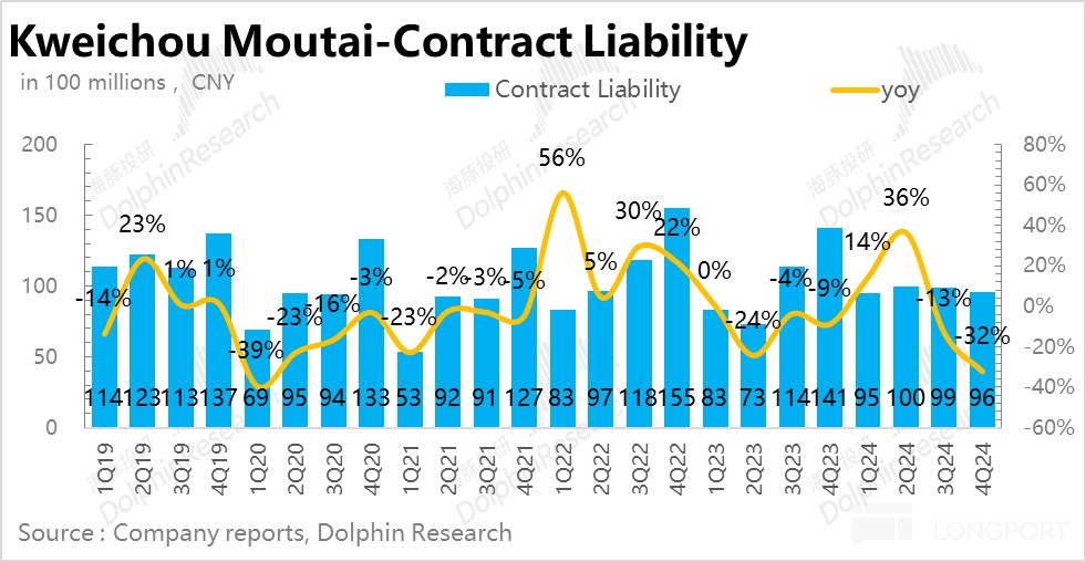从 “蓄水池” 合同负债项看,截至四季度末茅台合同负债为 96 亿元,相较于去年同期大幅下滑 32%,由于四季度之后是元旦、春节等重要节日,也是白酒消费的传统旺季,因此正常情况下经销商一般会打款力度会比较大,提前囤货应对旺季,因此四季度的合同负债一般是全年的最高峰。