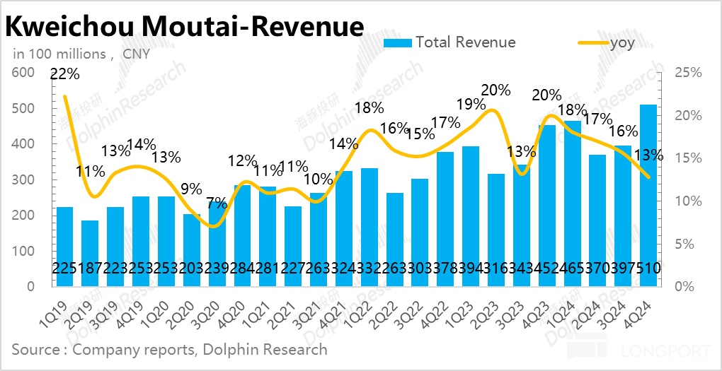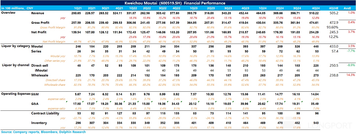 4Q24 茅台共实现营收 510 亿元,同比增长 12.8%,略超市场一致预期(市场预期为 505 亿元)。在去年四季度高基数的情况下增速较前几个季度略有放缓也在预期之内,全年维度公司营收端同比增长 15.7%,顺利完成了 2024 年年初制定的 15% 的目标,再次彰显茅台业绩的确定性(过去 10 年除了 2013 年国家层面限制 “三公消费”,其余时间均超额完成年初制定的目标)。