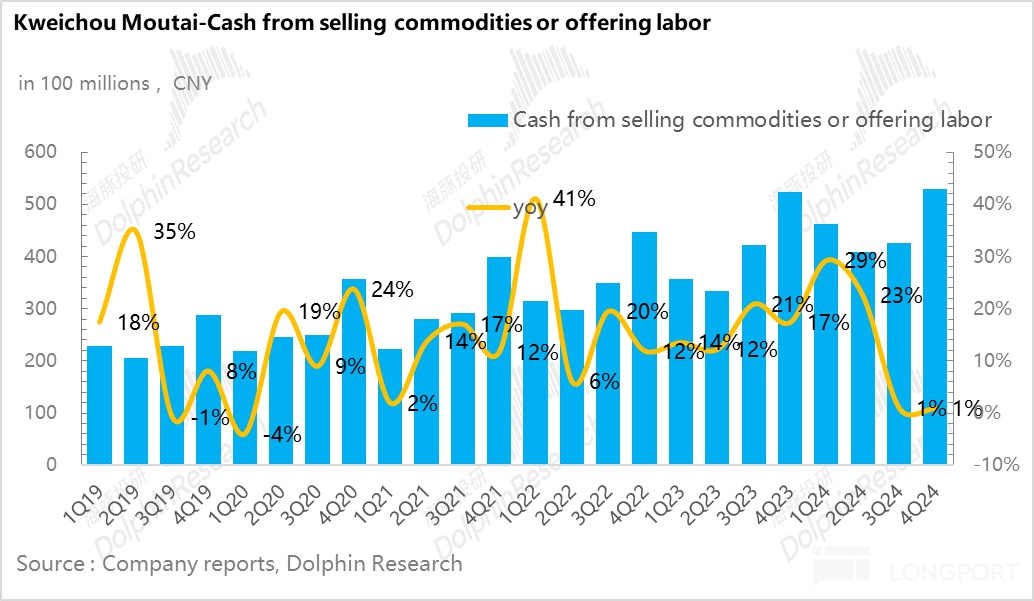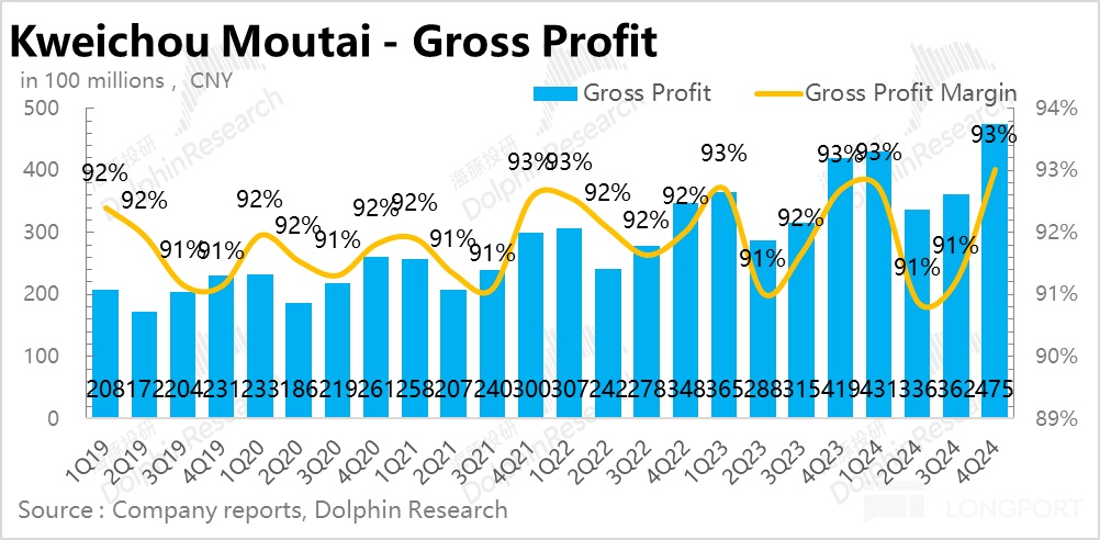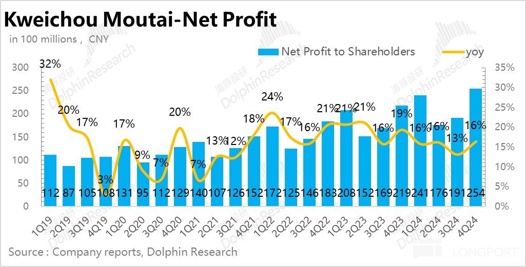 盈利方面,4Q24 茅台实现归母净利润 254 亿元,同比增长 16.3%,重新快于营收端增速,海豚君推测主要系四季度公司加大了茅台酒(非标 + 老酒)的投放力度。