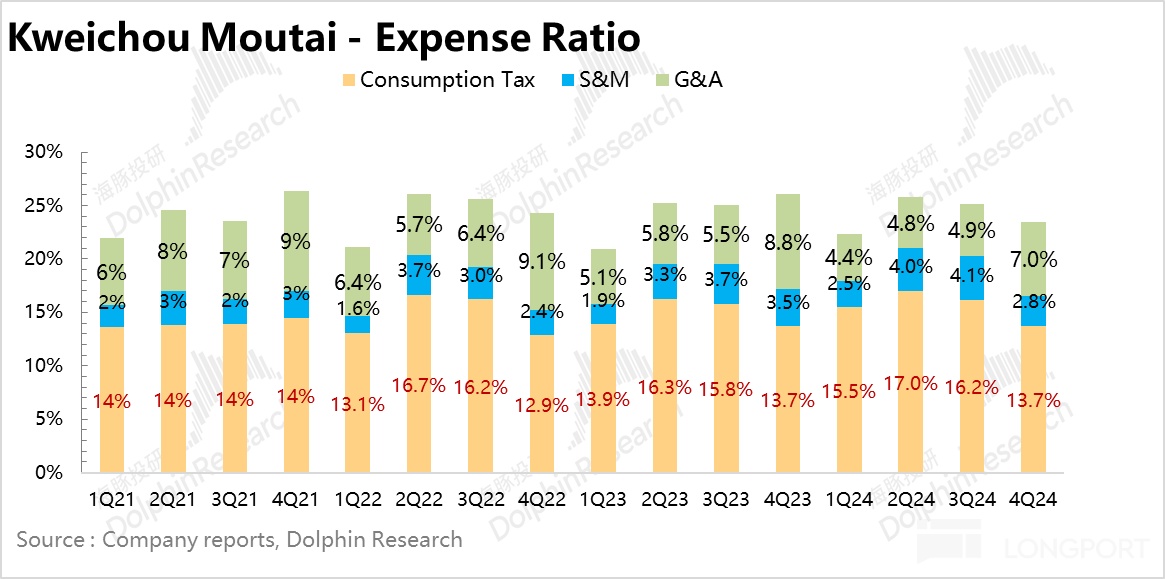 由于 Q4 茅台加大了非标产品的投放,产品结构小幅提升带动毛利率从去年同期 92.6% 小幅攀升至 93%,费用投放上,由于公司早在 2024 年年初茅台经销商大会明确表示要加大系列酒营销投入以抢占市场份额,因此销售费用率从 3.1% 小幅提升至 3.2%。茅台作为 “白酒老大哥” 都开始下场搞主动营销,积极求变,对其他酒企来说肯定更是压力山大。