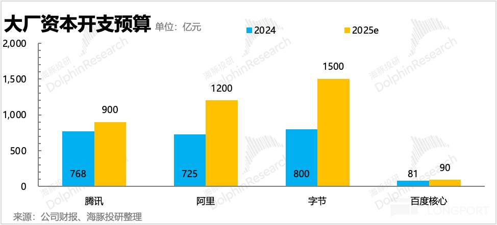 2025年的资本开支,腾讯的指引落在800-1000亿区间,如果加回Q4多花的100亿,那今年的预算也只是900~1100亿。这仍然要比算力产业链投资者们,通过对标阿里、字节的Capex,心中期望的1200亿要低的多,更不用说,更乐观的直接盲拍到了1500亿。显然,相比于阿里的“顺势而为”,腾讯的“谨慎”太令人扫兴。