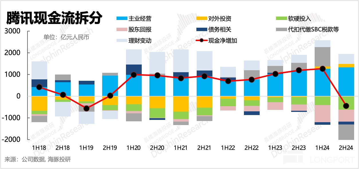 那么2025年,在腾讯额外需要多增加资本开支的情况下,基本经营、对外投资、资本支出、股东回报以及偿债付息等这五个关键的资金需求上,管理层又是如何配置的呢?当下的配置背后,又隐含了管理层怎样的战略思考?