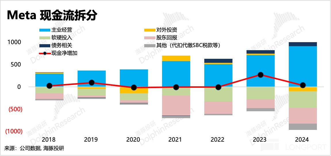 在具体的现金净流出上,Meta主要花在了软硬资产的投入、股东回报。尤其是在2021年大幅提高股东回报之后,两项主要支出几乎一半一半。这实际上是最合理的配置思路——经营赚到的钱,要么投入发展,要么分给股东。