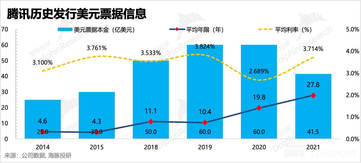 由于这些票据基本上都是5年以上,最高40年期限的债券,一旦发行,就锁定了多年的利息成本,因此非常考验腾讯的长期业务规划眼光。实际上,腾讯确实很会“择机”,发行时点基本选择在全球利率较低的时间,比如2014-2015年,2018-2019年以及2020-2021年,并且锁定的周期越来越长。而在2022年全球加息周期开启之后,腾讯就暂停了发行动作。