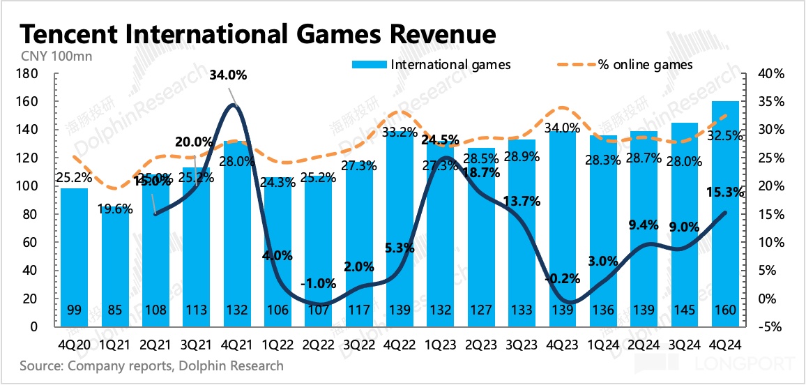 腾讯也有国际业务,主要收入来源是海外游戏收入,2024年创收580亿人民币,合80多亿美金。但在2021年“被迫” 执行加速出海战略之前,腾讯的海外游戏收入最高也就一年40亿美金。如果剔除30-50%的开发商分成,那么实际上也就是不到30亿美金的净收入。