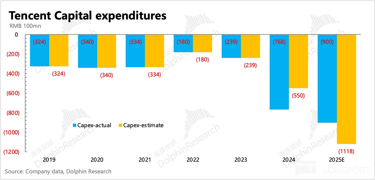 腾讯对2025年资本开支的预算是收入的low-teens,按照目前9%的收入增长预期,也就是对应着最低720亿,最高1080亿元的资本开支(Capex)。再收缩一下范围,也就是中位数900亿左右。