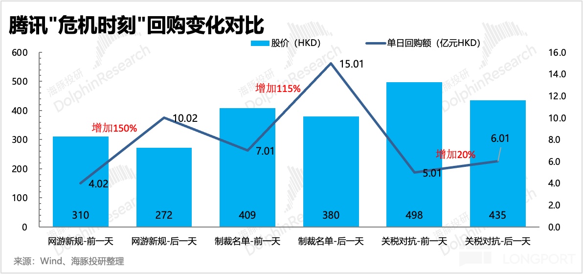 ——关税发布后的4.7,腾讯市值单日跌了12%,但腾讯并没有像2023年底的网络游戏新规、2025年初的美国防部制裁名单两个事件窗口期那样,当天显著加大回购力度。