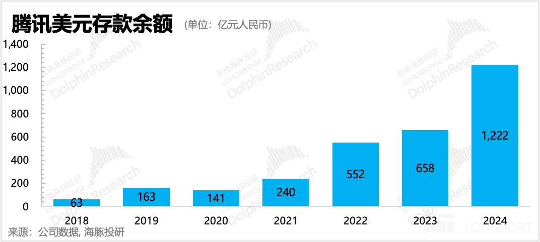从最终腾讯持有的美元存款来看,存款余额逐年走高,但2024年末美元存款余额近170亿美元(折合1222亿元人民币,均为短期),明显少于这几年积累的美元债务(借款+票据)357亿美元。