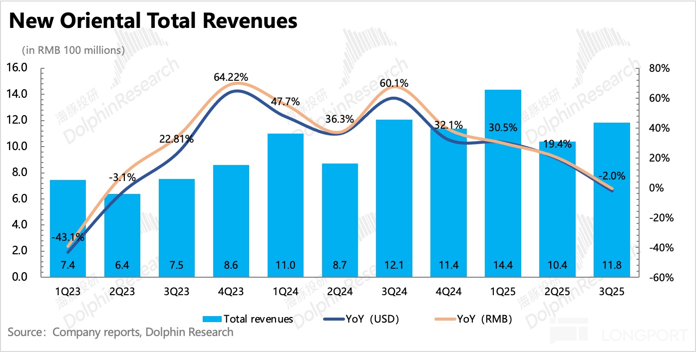 25 财年三季度,新东方实现总营收为 11.83 亿美元,同比下降 2%。剔除直播业务的核心教育收入为 10.38 亿,略高于公司指引区间上沿。
