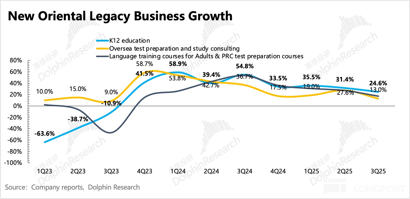 但随着特朗普政府的本地保护主义导向,留学需求可能已经从去年底(对应 Q2、Q3 业绩期间)开始了一波明显放缓。一般而言,考培需求先于留学咨询服务,Q3 考培收入增速快速滑落至 7%,足以体现消费者的忧虑。