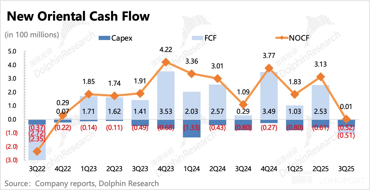 三季度经营性净流入只剩不足 100 万美元,同比大幅下降,主要是留学业务对学费流水的影响,短期递延收入环比下降相比往常要更多。与此同时伴随产能扩张带来的团队、运营新增支出,拖累了利润,进而整体影响了现金流。三季度资本支出 0.54 亿美元,最终 3Q25 的自由现金流为负。