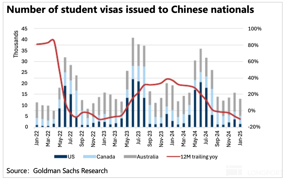 下图中,年初以来留学签证发放量同比下降 10%,这里面还未体现关税贸易战的影响,主要还是宏观导致的自身需求减弱。
