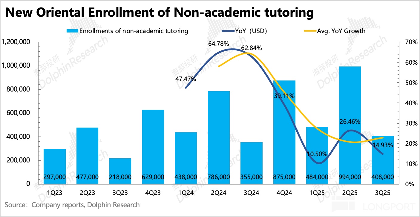 短期来看,景气度能够持续。Q3 非学科入学人次 40.8 万人,考虑不同年份寒假早晚的问题,海豚君将连续两个季度放在一起看平均增速,Q3 与 Q2 差不多,平均增速稳在 20% 以上。