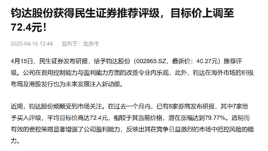 代表着外资趋势的北向资金连续三个月净流入钧达股份,港股通持仓占比从年初的 2.3% 升至 4.1%,说明诸多长线资金已在逆周期布局。