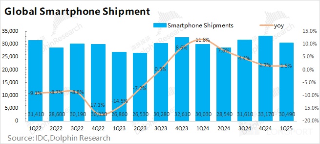 结合行业数据看,2025 年第一季度全球智能手机出货量为 3.05 亿台,同比增长 1.5%。行业面增速继续维持低个位数,即使在中国补贴政策的带动下,全球手机市场的需求仍相对低迷。
