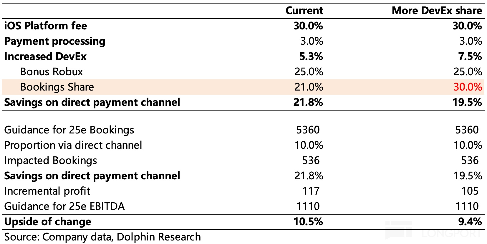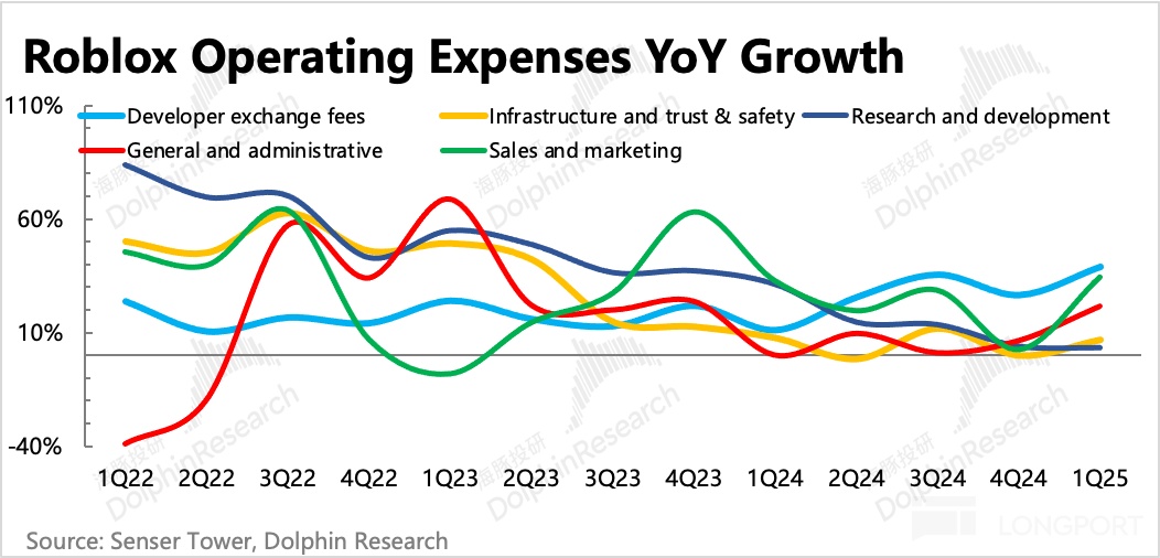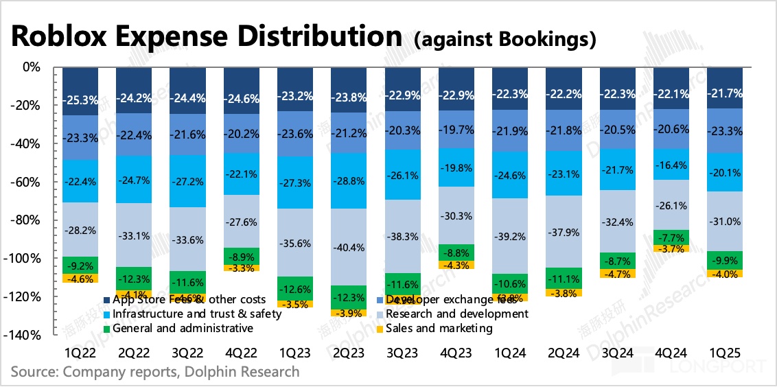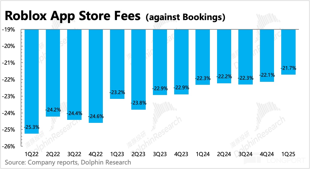 6. 推动的渠道改革奏效:一季度毛利率环比提升 0.4pct,达到 78.3%。Roblox 的成本主要就是渠道分成,比如移动支付的苹果税、谷歌税。上季度起,公司有意引导用户去官网直接充值(赠送额外的 Robux 进行激励),仅一个季度已经能看到正面影响。