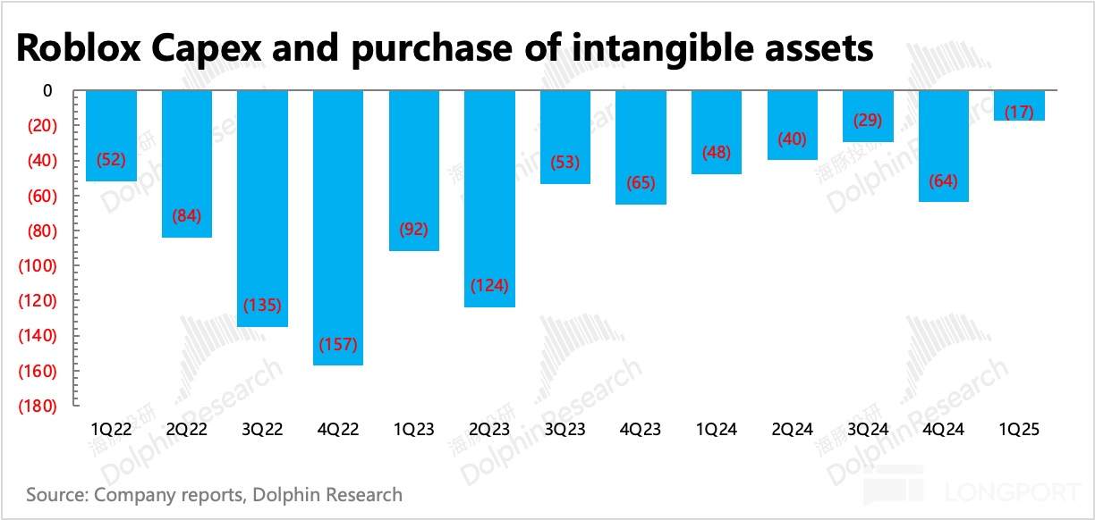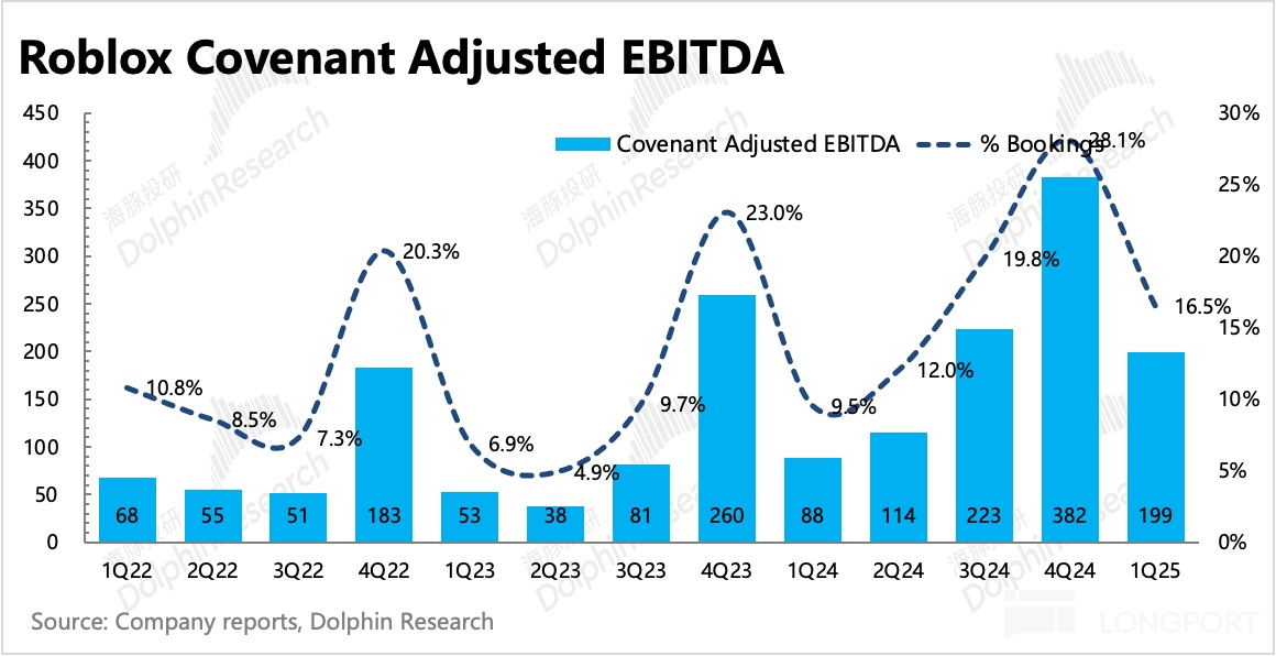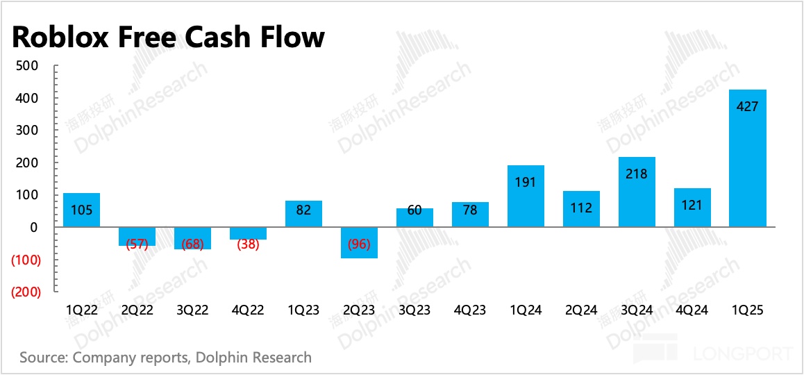 但从现金流上看,Roblox 改善速度很快。一季度自由现金流 4.3 亿,占流水比重 35%,这个现金流状况非常健康,显著超出市场预期。从 EBITDA 指引上来看,二季度以及 2025 全年目标也都超出市场预期。