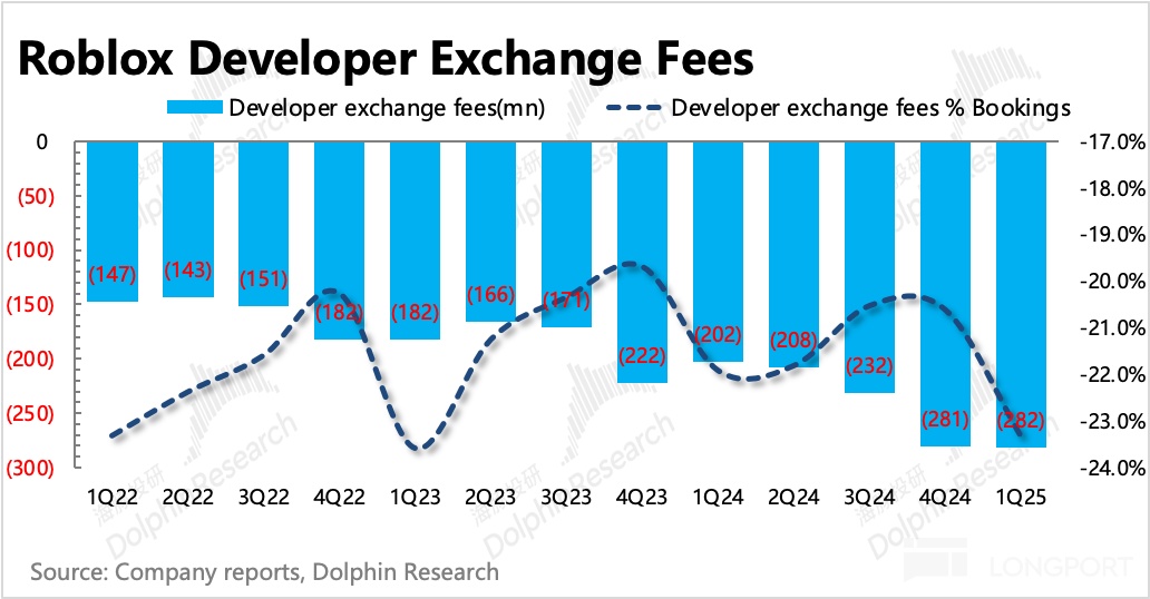 5. 开始进一步让利开发者:Roblox 正常情况下 20% 的流水分成在整个游戏行业中并不具有优势,会被动过滤掉很多优质开发者。虽然管理层也一直在说要提高分成,但这个季度才终于从指标中看到变化。一季度开发者费用占流失比重提高到了 23%,虽然短期会延缓减亏节奏,但从中长期视角,这是完善生态的关键一步。