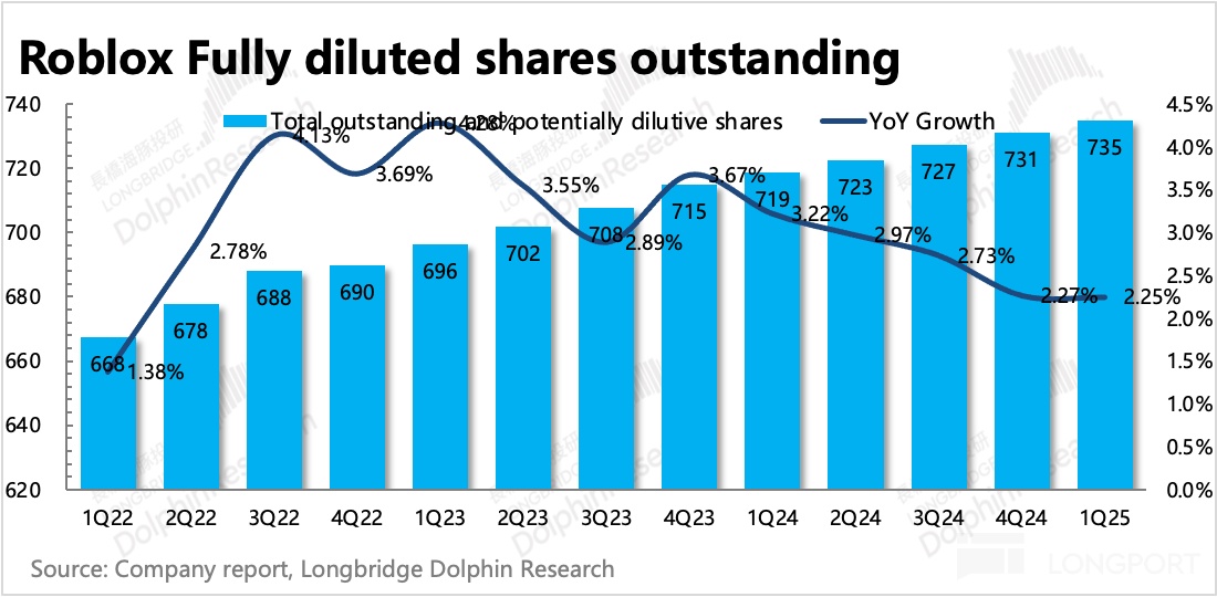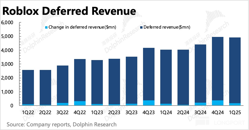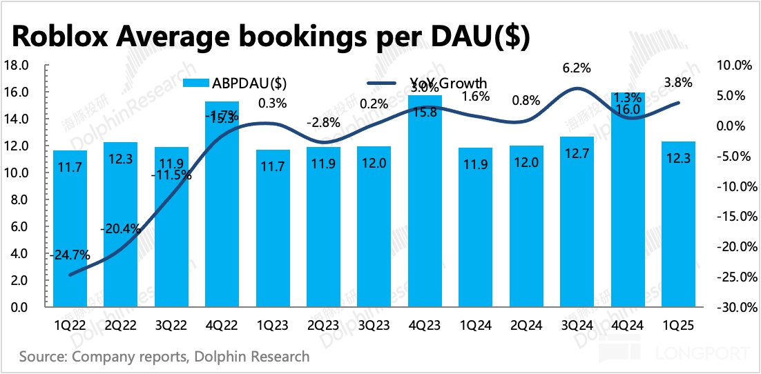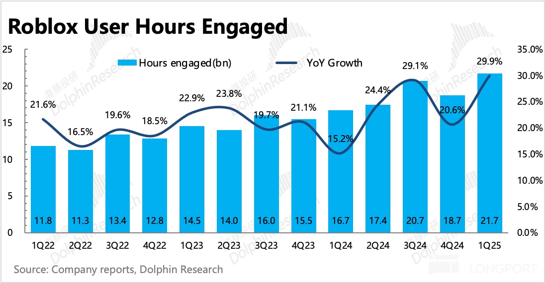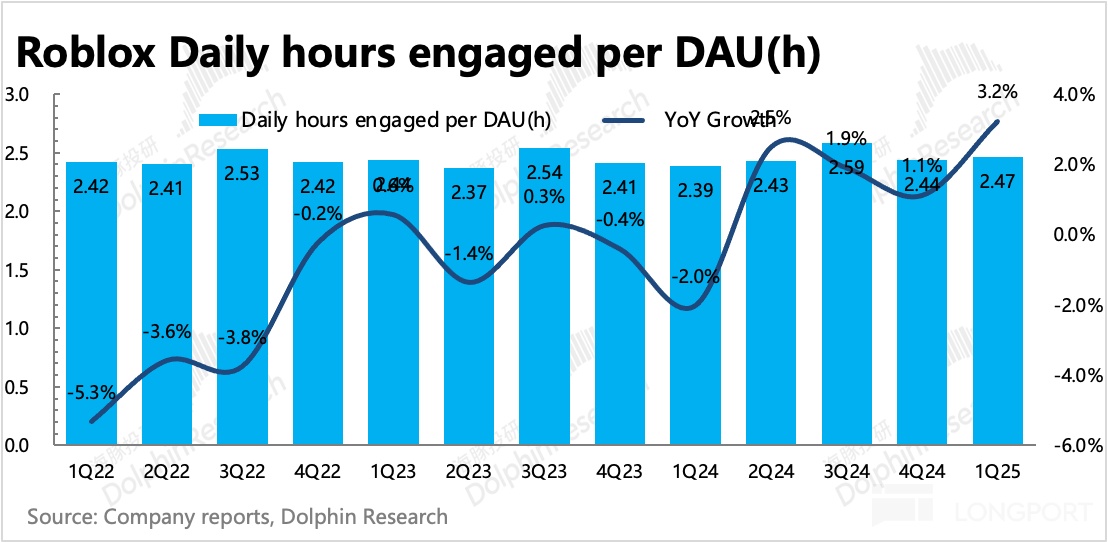 上季度正式由于人均时长保持增长,海豚君才对 Roblox 的用户扩张趋势没那么担忧。一季度人均时长再次同比增加 3.2%,尤其是 Q1 新增了很多新手玩家的基础上,这个粘性体现出核心用户对平台的忠诚度,以及平台内容的不断丰富。