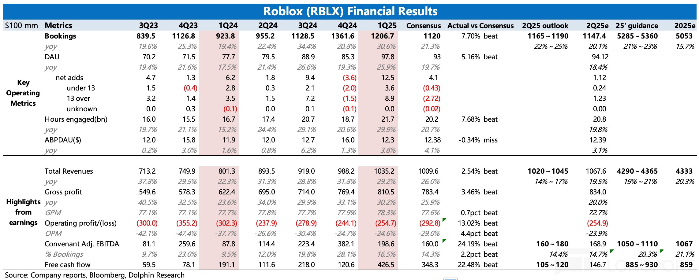 $罗布乐思(RBLX.US) 美东时间 5 月 1 日美股盘前发布了 2025 财年第一季度业绩。整体来看,业绩不错,我们重点跟踪的核心成长指标和盈利指标均超预期,体现了公司在保证生态活跃的基础上,内部经营效率同步稳定提升的健康趋势。