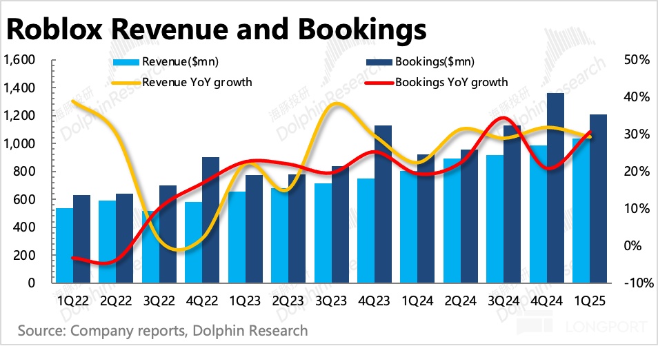 4. Bookings 重回高增长趋势:一季度 Bookings 流水同步回到 30% 的增长。目前人均花费基本保持稳定,因此流水变化主要跟随 DAU。公司指引二季度 Bookings 增速水平在 22-25% 区间,超出市场预期,2025 全年目标也顺势上提。