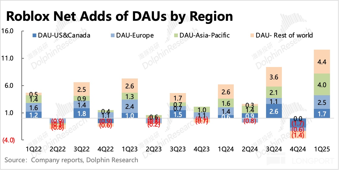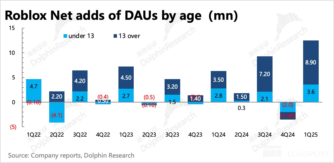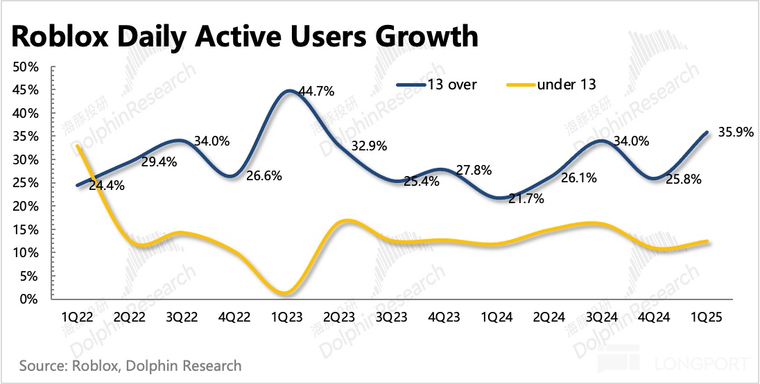 1. 用户活跃如期恢复:上季度 DAU 用户增速滑坡引发了市场的担忧,是当时财报后大跌的主要原因。当时电话会上公司给出了解释——前一年引入 PlayStation 版导致了高基数,以及土耳其等地对 Roblox 的临时禁令等影响。此外增加家长监督机制,也对 13 岁以下儿童用户的活跃带来了一些影响。