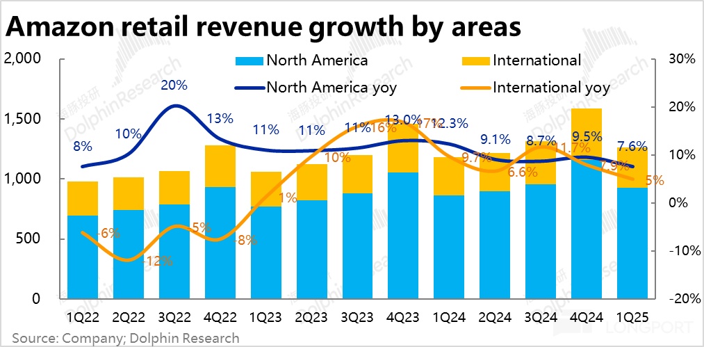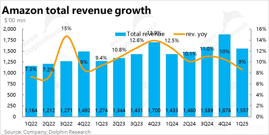 由此可见,北美和亚马逊主要经营的欧洲等国际地区的增长确实都是呈现走弱迹象,绝对表现显然算不上好,但也并没有被关税和宏观因素 “吓坏” 的卖方预期的那么低。