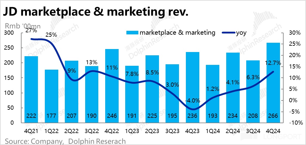 2、平台服务收入:主要面向 3P佣金广告 +1P 的广告业务本季收入 233 亿元,同比 16%,正常增速要跑超自营业务的高毛利 3P 业务再次跑输自营通电业务,其实说明的问题是,国补带来的通电产品才是根本流量来源。