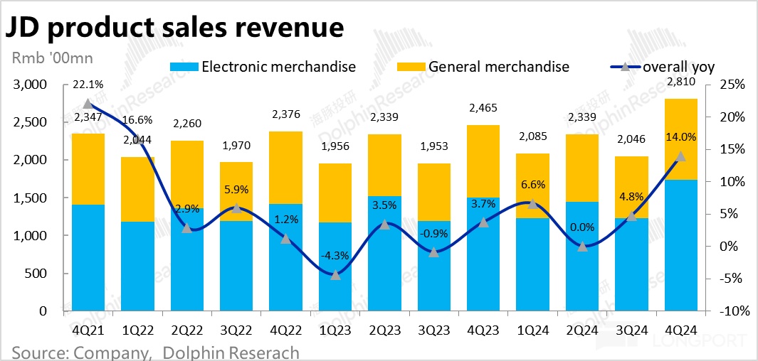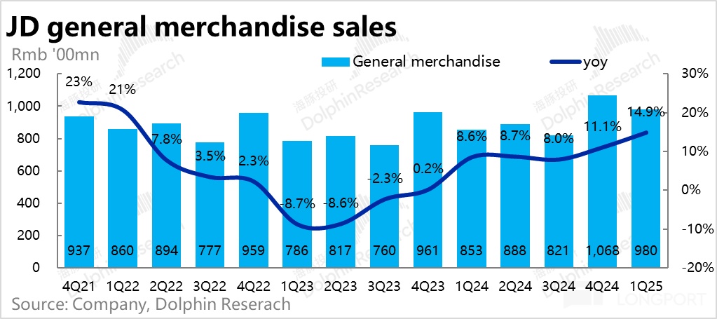京东自营卖的一般商品零售的增在通电品类流量的助推下,同比增长也进一步拉到了 15%,单季收入 980 亿元。