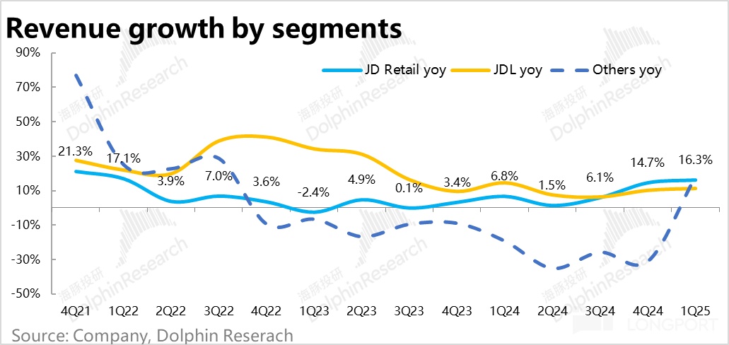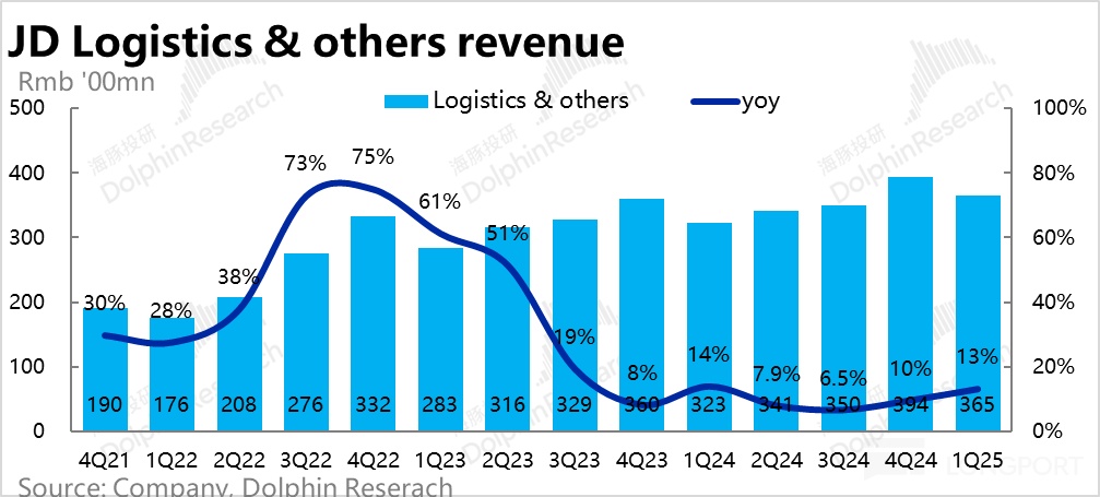4. 包括$京东物流(02618.HK) 、达达快送的物流板块本季收入增速同比 13%,环比增加 3pct, 有加速增长,但效果明显没有商城业务好。