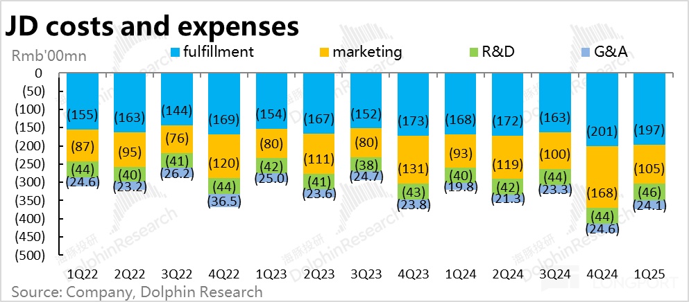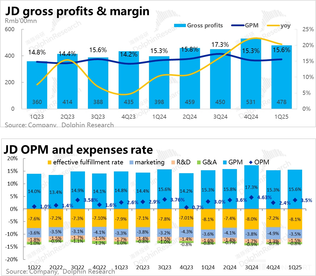 这个季度毛利率同比提升了 0.3 个百分点,到了 15.6%,表现非常出色,毛利润接近 480 亿元。核心原因一季度用户补贴是国补出腰包,平台反而省钱了。
