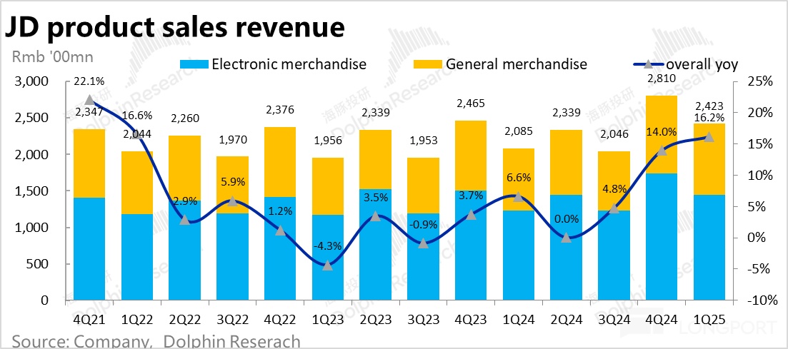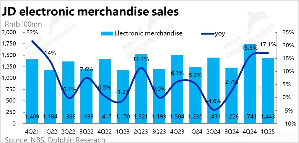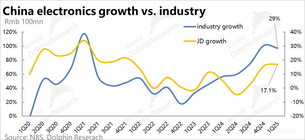 海豚君把社零中的家电音响和通讯两大品类加总之后的行业增长一季度本身 29% 的增长,可能这轮补贴受益最多的是线下,京东并未跑超整体增速。