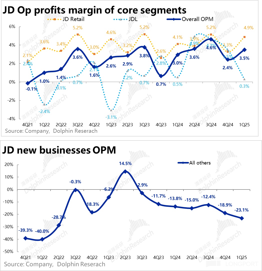 当然在估值够低的情况下,关键要关注的是接下来的边际变化,但京东因为新业务重新进入投入期,并不算好: