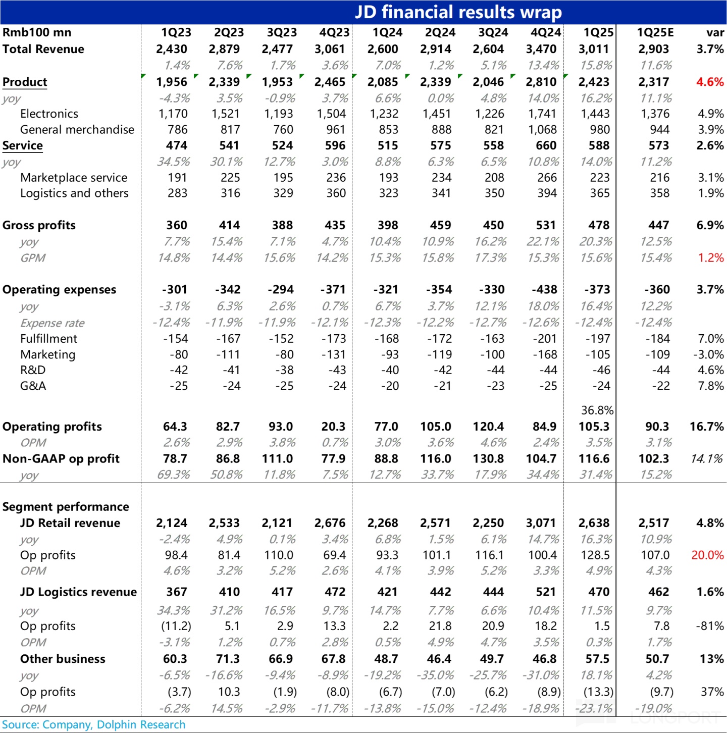 北京时间 5 月 13 日晚美股盘前,$京东(JD.US) 公布了 2025 年一季度财报。乍一看,还挺不错,但实际真有那么惊艳?先看快速过一下数: