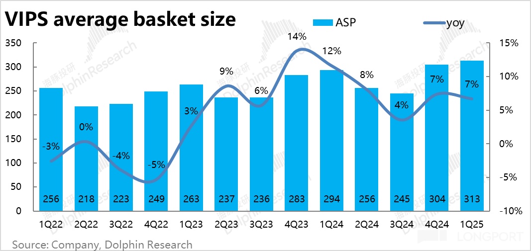 具体来看,活跃用户数和订单量本季度还是下滑的,前者同比减少了 180 万人(约 4%),后者也下滑了 6%。但边缘用户流失的同时,核心用户进一步提纯;剩下的忠诚用户复购频次和客单价更高,从而在量跌的同时,通过价涨(客单价同比上升约 7%),守住了 GMV 指标同比持平。