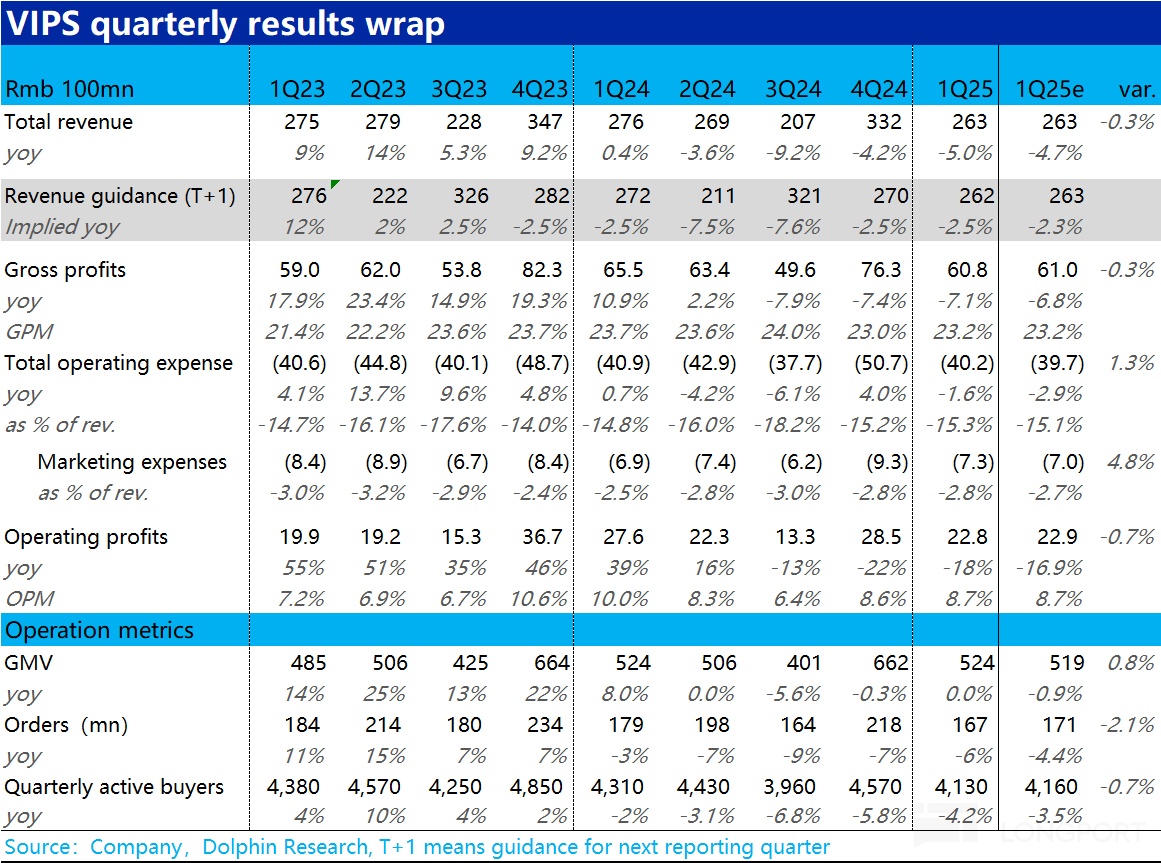 北京时间 5 月 20 日美股盘前,$唯品会(VIPS.US) 发榜了 2025 年 1 季度财报,概括来看属于预期内的差,收入和利润双双负增长,活跃用户也继续流失。但对此市场也早有预期,各项指标大体都和预期接近,具体来看: