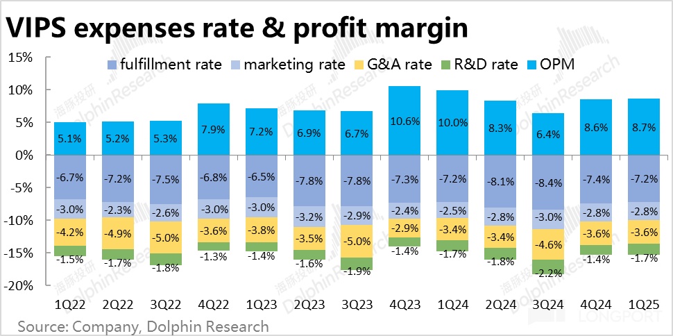 4、费用端,唯品会本季总经营支出为 40.2 亿,同比减少了 1.6%。体现出公司在业务下滑的情况下,做出了一定控费进行对冲的努力。但收入的同比下降幅度比费用更大,因此费用率还是同比扩张了 0.5pct。具体来看,营销费用本季仍同比增长了约 6%,体现出公司为了重回增长,在获客和补贴上确实增大了投入。