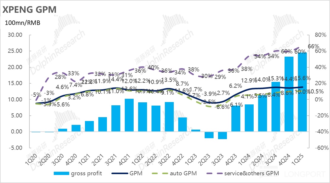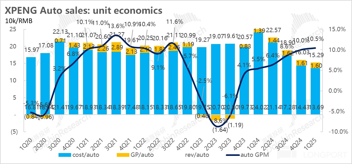 而小鹏管理层之前给过指引,说一季度汽车业务毛利率是会呈现环比改善趋势,且能站上双位数,虽然单价因为车型结构下沉在下滑(低价小车 Mona M03 占比提升),但会受益于规模效应拉动,所以本季度实际卖车毛利率走的也正如管理层指引,略超预期的状态。