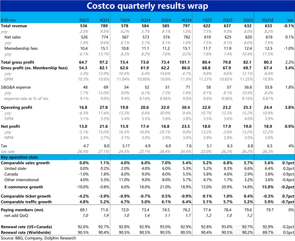 3. Kirkland Signature 品牌策略:第三季度销售额增速超过整体销售,销售渗透率同比提升约 50 个基点。将更多商品采购转移至销售所在国家 / 地区,降低成本并缓解关税影响。