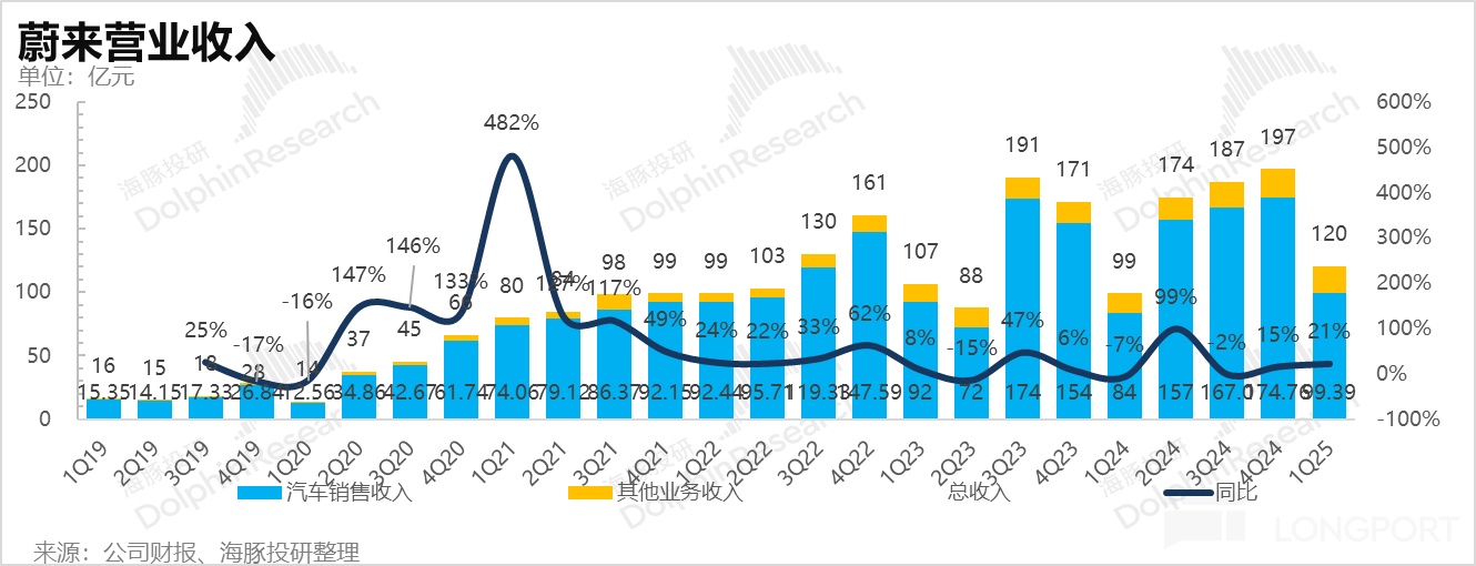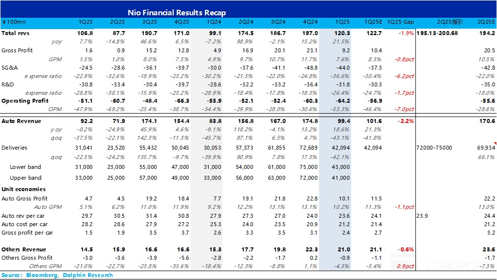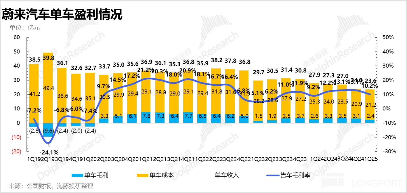 2. 卖车毛利率又环比回落到 10% 左右,和与市场之前沟通的一致:从卖车毛利率来说,蔚来之前其实也已经沟通过本季度卖车毛利率 10% 左右(4Q24 业绩会之后),而环比回落的原因主要由于单价下滑,再加上销量本季度环比下滑 42%,导致的单车摊折成本的上升。