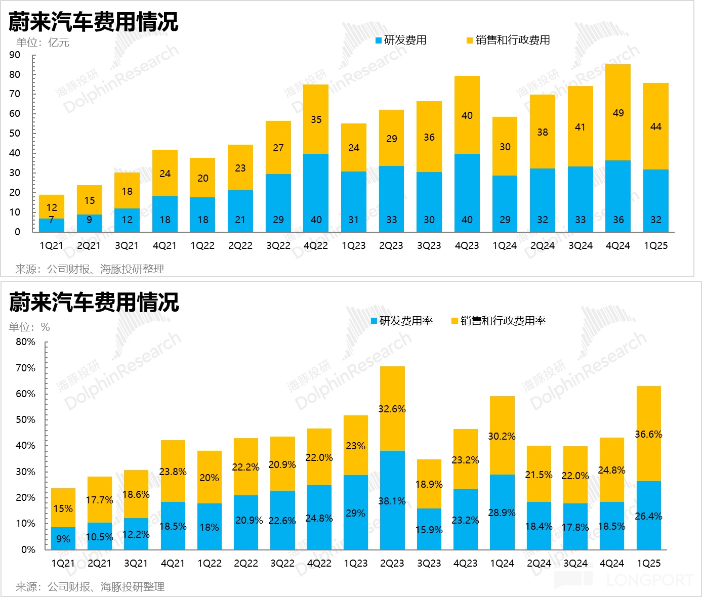 蔚来为塑造豪华车品牌,开支上一直非常 “豪放”,现金流吃紧的一季度,蔚来在三费开支上并没有明显的收缩迹象: