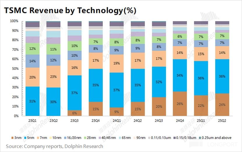 本季度 7nm 以下的收入占比再次提升至 74%,先进制程领域的收入已经是公司的核心来源。具体来看,本季度公司 3nm 收入占比为 24%,5nm 的收入占比维持在 36%。当前公司的 3nm 和 5nm 产能都已经满产,公司准备下半年开启 2nm 的量产。