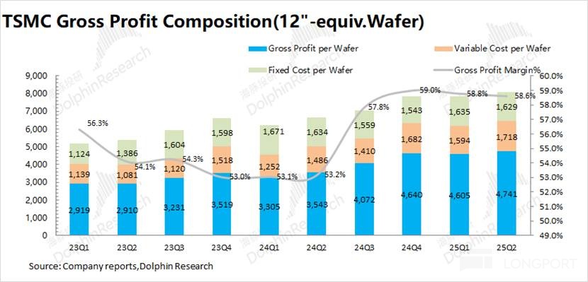 3)可变成本(其他制造费用):本季度台积电平均可变成本约 1718 美元/片,环比增加 124 美元/片。受新台币升值的影响,公司本季度单位可变成本有明显增加。