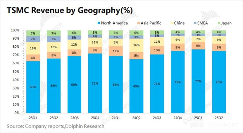 从各地区收入来看,北美地区仍是台积电最大的收入来源,收入占比为 75%。这是由于北美地区有苹果、英伟达、AMD、高通等大客户,使得台积电和美国之间有很强的商业绑定关系。