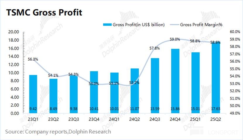 台积电在 2025 年第二季度实现毛利 176.3 亿美元,环比增长 17.4%。其中毛利率 58.6%,环比下滑 0.2pct,公司本季度主要受新台币升值和海外建厂的影响。