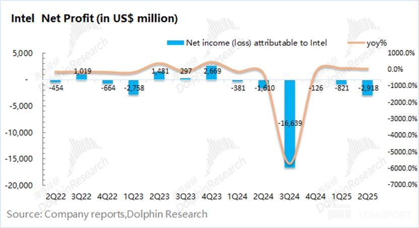 1.4 净利润端:英特尔在 2025 年第二季度净利润为-29.2 亿美元,亏损再次扩大,主要是受一次性减值费用和遣散费等因素影响。