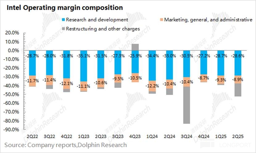 1.3 经营费用端:英特尔在 2025 年第二季度经营费用为 67.2 亿美元,同比增长 3.2%。其中包含了将近 19 亿美元的一次性费用影响,其中绝大部分费用与公司根据重组计划进行裁员所产生的遣散费相关。公司新任 CEO 定下 “削减成本开支” 的目标后,经营费用也是一个关注点。