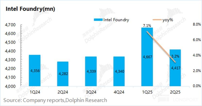英特尔的晶圆代工业务收入在 2025 年第二季度实现 44.2 亿美元,同比增长 3.2%。结合公司本季度的各业务内部的抵消总额也有 44.2 亿美元,可以看出公司当前的晶圆代工基本都是对内服务,对外代工收入极少。